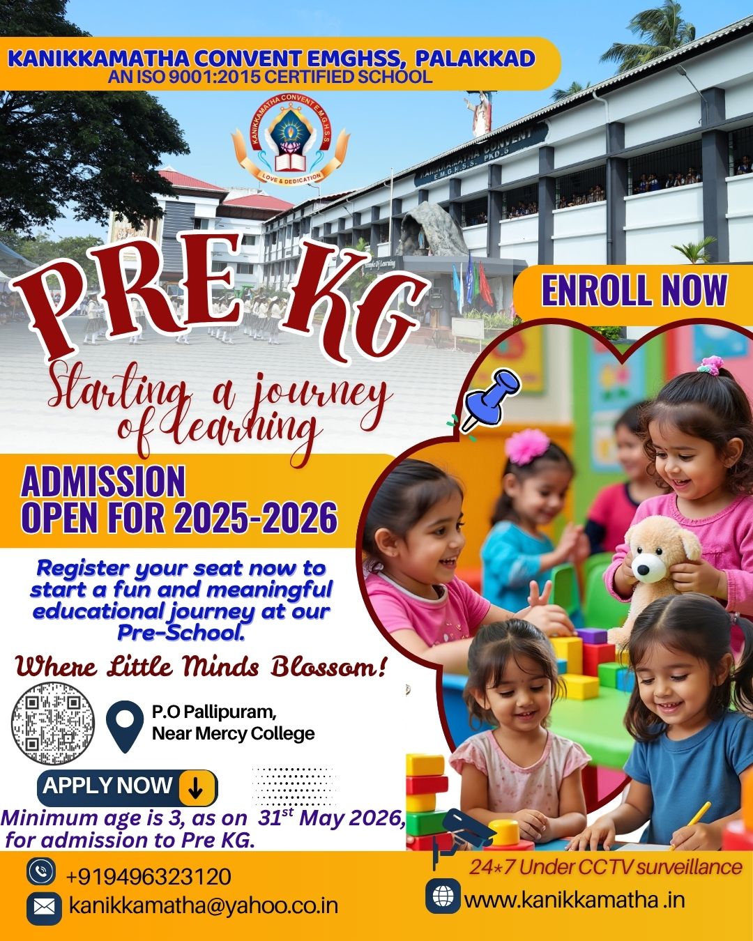 Kanikkamatha Convent English Medium Girls Higher Secondary School is one of the most prestigious educational institution in Palakkad. The school is running under the effective patronage of the Congregation of the Mother of Carmel (CMC Sisters). Having started in 1961 after days of ceaseless prayers, the school took its shape in a small shed in the district of Palakkad. The Institution came into being at a time when Palakkad was much backward in the educational field.